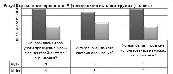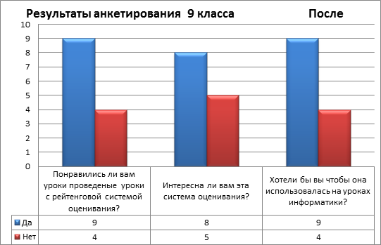 Цель: Определить отношение учащихся 9 класса школы МОУ СОШ №1 г. Черняховска к рейтинговой системе оценивания после проведенной работы. (Вопросы анкеты Приложение №3)
