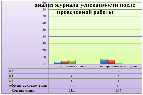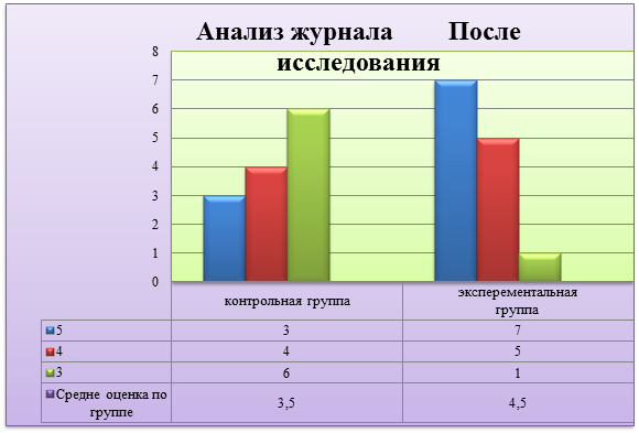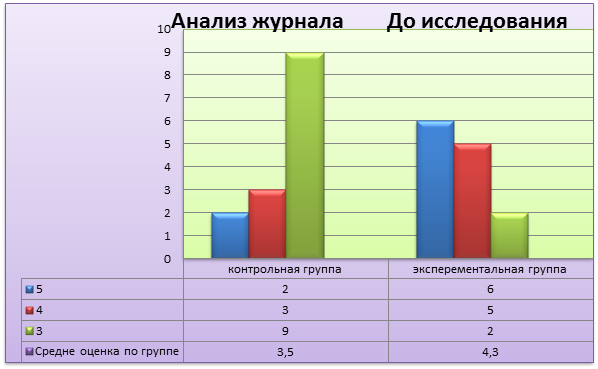 После анализа журнала успеваемости мы выяснили, что в 9 классе МОУ СОШ №1 г.Черняховска в контрольной группе «5»-2 учеников из подгруппы, «4» имеют 4 , «3» имеют «6»