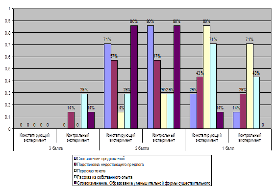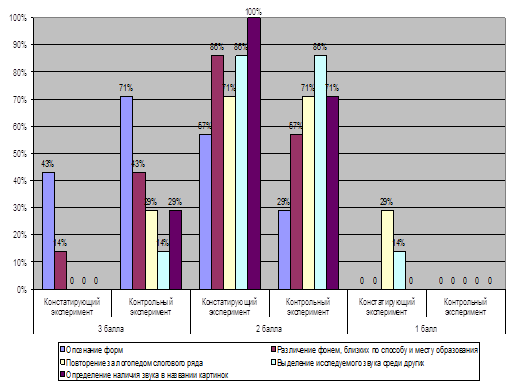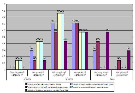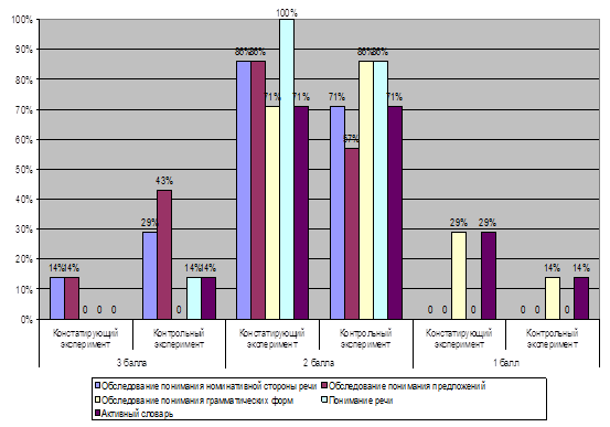 Из диаграмм видно, что по уровню сформированности различных сторон речи на этапе контрольного эксперимента уменьшилось число детей, которые получили за выполнение заданий 1 балл, по всем заданиям стало больше детей, получивших по 2-3 балла, то есть повысился уровень сформированности фонематического слуха, звукового анализа слова, увеличился активный словарь и улучшилось понимание речи и ее грамматический строй.