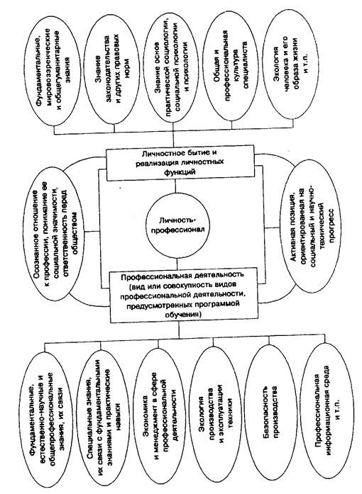 Методология оптимальной разработки требований к выпускнику инженерного вуза заключается не только в учете подходов и взглядов сфер высшего образования и профессиональной деятельности специалиста, не только в интегральном отражении общих и специфических черт современного работника техносферы, но и в учете всех связей личности профессионала с обществом, окружающей средой и профессиональной сферой (рис.1).