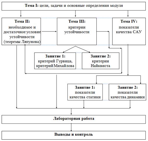 В структуре курса “Теория автоматического управления” нами было выделено три основных функциональных модуля (ФМ) системно-операционного типа: 1) основные понятия и определения в области ТАУ; 2) устойчивость линейных систем и качество процесса управления; 3) синтез систем автоматического управления. Построение модулей по системно-операционному принципу способствует наряду с развитием умений практической деятельности будущего специалиста формированию у него системы фундаментальных и профессиональных знаний, определяющих перспективное развитие и адаптацию к новым, изменяющимся задачам и условиям труда. В Прил. 7 представлена рабочая учебная программа всего курса ТАУ, а на рис. 2 блок-схема II модуля “Устойчивость линейных систем и качество процесса управления”.