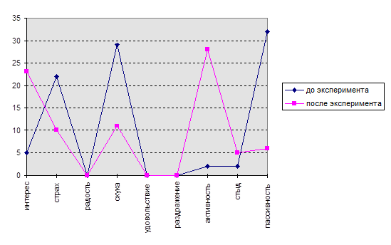 Анализ данных показал (рис. 13), что при обучении по модульной программе у студентов возросли такие эмоции как интерес к предмету (5 человек до эксперимента, 23 человека после эксперимента) и активность (соответственно 2 и 28 человек); снизились страх (22 и 10 студентов соответственно), скука (29 и 11 человек до эксперимента и после него), пассивность (32 и 6 студентов соответственно). Парадоксален тот факт, что возросло число студентов, испытывающих на занятиях по экспериментальной программе чувство стыда (от 2 до 5 человек). Хотя его можно объяснить повышенной степенью самолюбия в юношеском возрасте, когда какие-либо неудачи, в том числе и в учебной деятельности, приводят к обострению чувства неуверенности в себе, стыда и т.п.