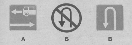 Ответ: Знак «Выезд на дорогу с полосой для маршрутных транспортных средств» (знак А) устанавливают перед выездом на дорогу, на которой общий поток ТС движется слева направо, а маршрутные ТС по своей полосе – справа налево. По полосе для маршрутных ТС движение других ТС запрещено. Таким образом, повернуть налево на перекрестке, перед которым установлен знак, нельзя. Знак «Разворот запрещен» (знак Б) запрещает только разворот, поворот налево при этом возможен. Знак «Место разворота» (знак В) указывает место для разворота на участке многополосной дороги между перекрестками. При этом поворот налево в этом месте, например во двор, запрещен.