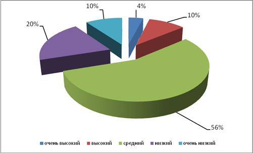 Таким образом, как видно из рисунка 1, в группе 4% человек имеет очень высокий уровень обученности, 10% человек – высокий уровень, 56% человек – средний уровень, 20% человек – низкий уровень и 10% человек – очень низкий уровень обученности.