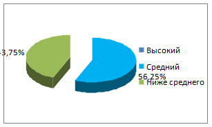 Как видно из таблицы детей с высоким уровнем физической подготовленности нет. Со средним уровнем физической подготовленности 9 человек, соответственно с уровнем ниже среднего 7 детей. В процентном соотношении распределение детей по уровням физической подготовленности представлено на рис 1.