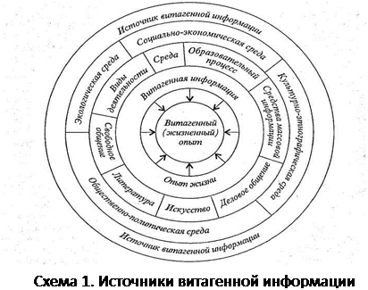 Из приведенной схемы видно, что источниками витагенной информации являются средства массовой информации, литература, произведения искусства; социальное, деловое, бытовое общение, различные виды деятельности, образовательный процесс.